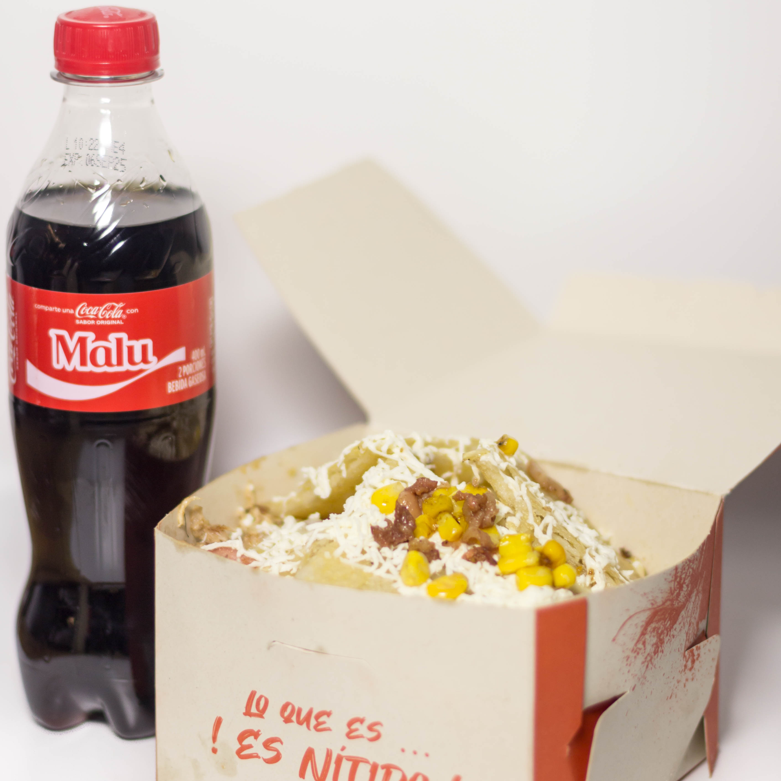 Papas a la francesa con pollo, cerdo, chuleta ahumada, tocineta, salchicha, arepas, con queso mozzarella y queso rallado. + Gaseosa