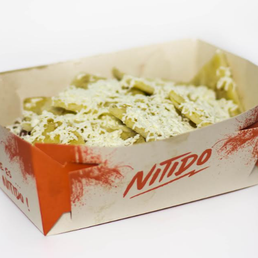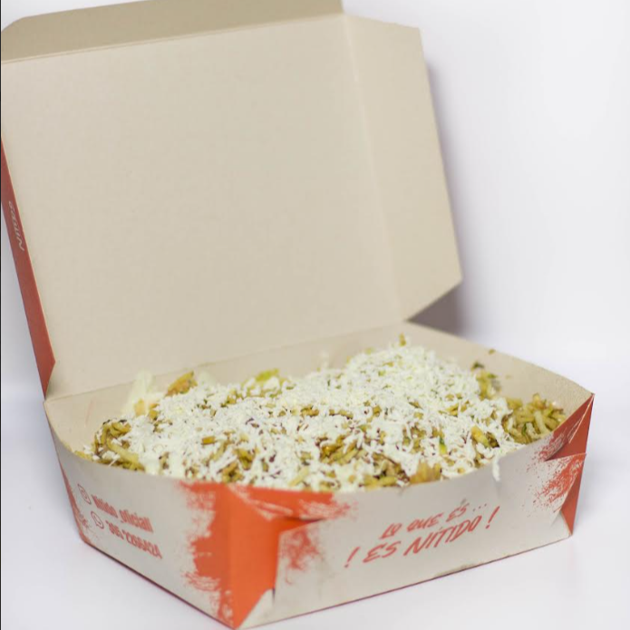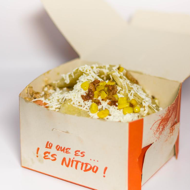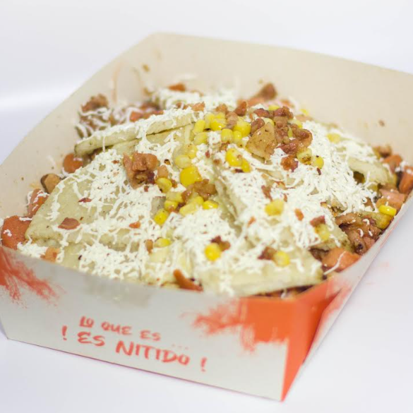Deliciosas papas con salchicha, tocineta, pernil de cerdo, pollo, queso mozzarella, queso rallado y arepa con queso.