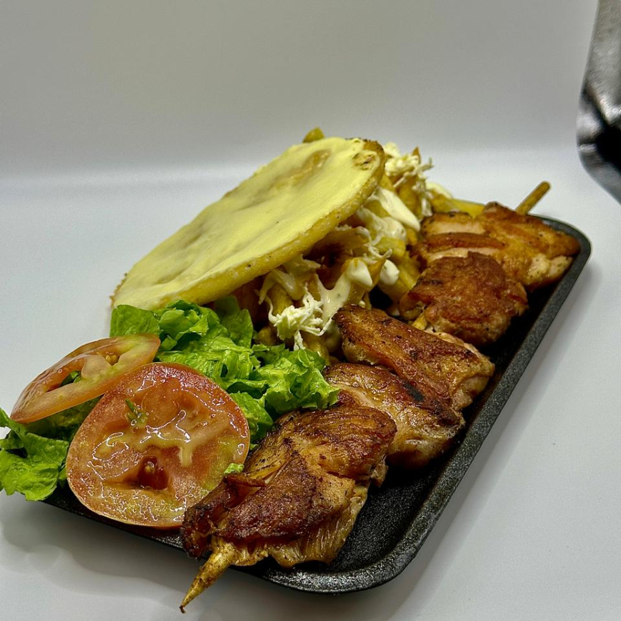 Chuzo de 250gr de pollo a la plancha, ensalada de lechuga crespa con tomate y vinagreta casera, con papas a la francesa y acompañado de arepita con queso y queso rallado,