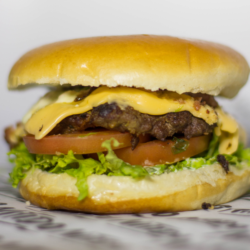 Pan artesanal, carne de res de 200gr, queso cheddar, lechuga y tomate