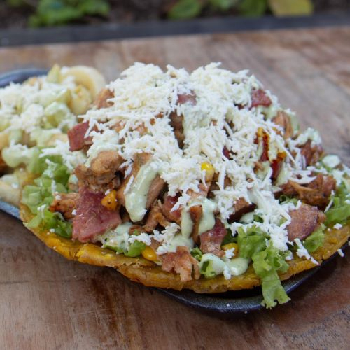 Res, pernil de cerdo y pollo sobre una base de lechuga crespa con tomate y ensalada de repollo, doble quedo mozzarella, tocineta, ripio, queso rallado y nuestra deliciosa salsa de ajo de la casa.