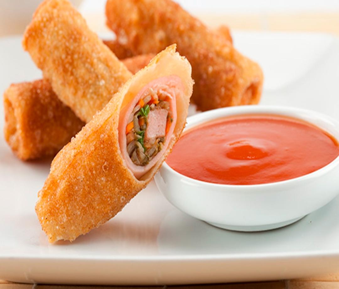 2 rollitos fritos rellenos de verduras con carne, jamón y repollo, acompañados de salsa agridulce.