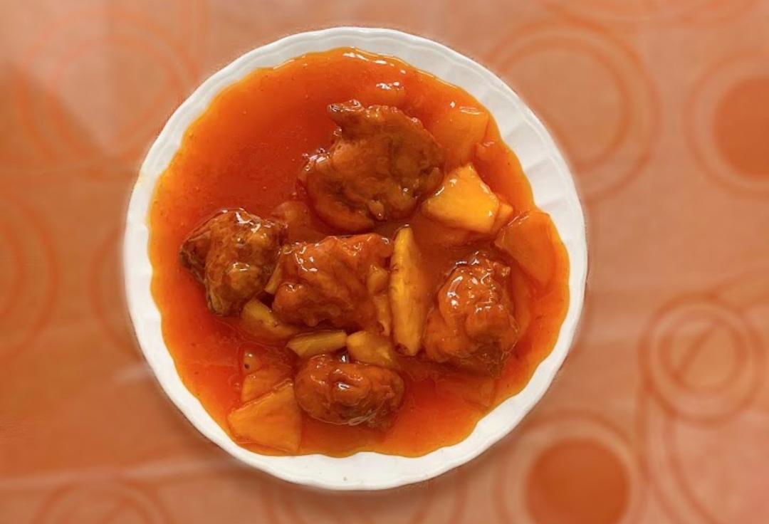 Croquetas de pollo y piña en salsa agridulce.