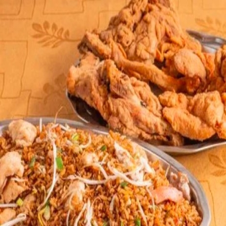Combinado grande de arroz chino, un acompañamiento a elegir y 8 presas de pollo broaster. (Para máx. 5 personas)