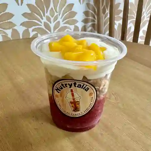 Postre con una base de mermelada de frutos rojos, Yogurt griego con proteina de vainilla acompañado de granola, banano y durazno