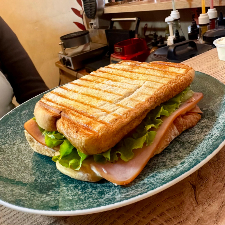 Sandwich con pan artesanal, jamon ahumado, queso mozzarella, tomate y lechuga fresca.
