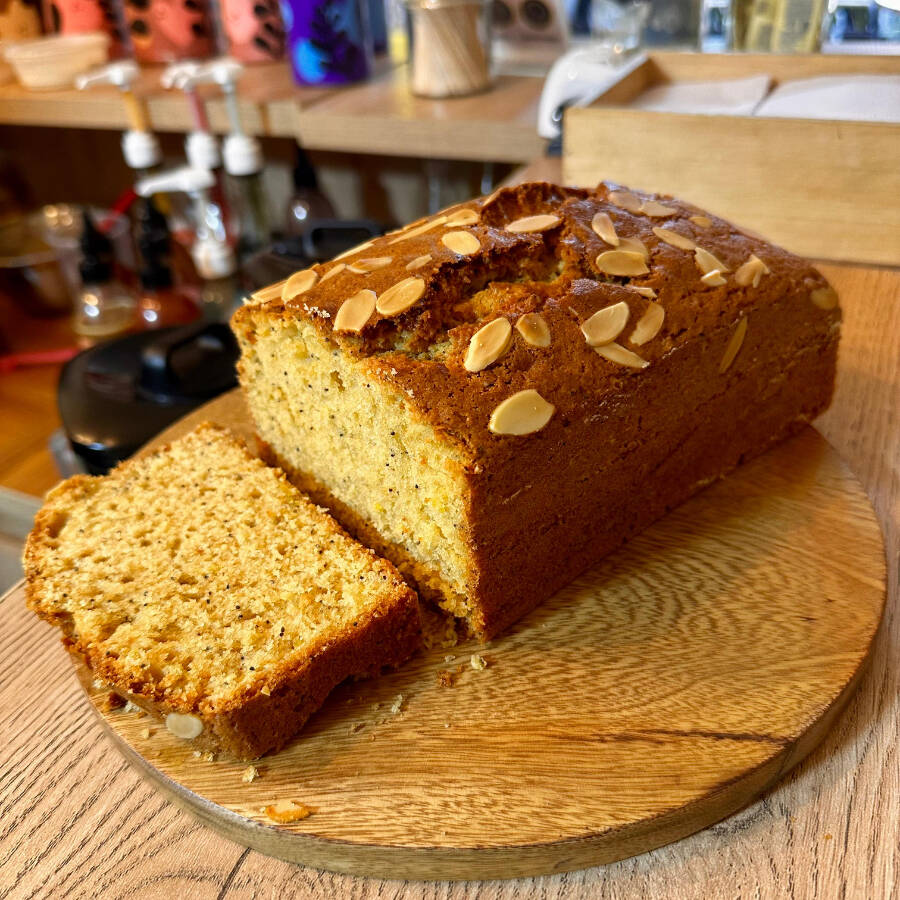 Exquisita porción de Torta elaborada con Harina de almendras, naranja y semillas de amapola.