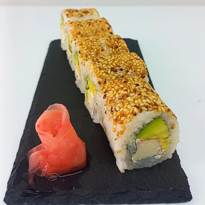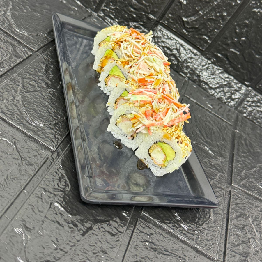 10 bocados relleno de palmito de cangrejo, vegetales tempura y aguacate, con rico topping de kanikama vermicelli, bañado en salsa agridulce.