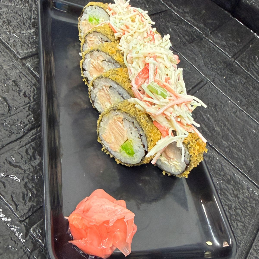 Rollo tempura relleno de cangrejo apanado, salmón y aguacate, con topping de salsa spice mayo.