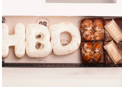 Letras HBD en alfajor (galleta suave con relleno de arequipe) y 4 mini brownies de Milo.