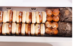 Caja de 4 brownies bites, con toppings a elegir y 10 bites de alfajor.