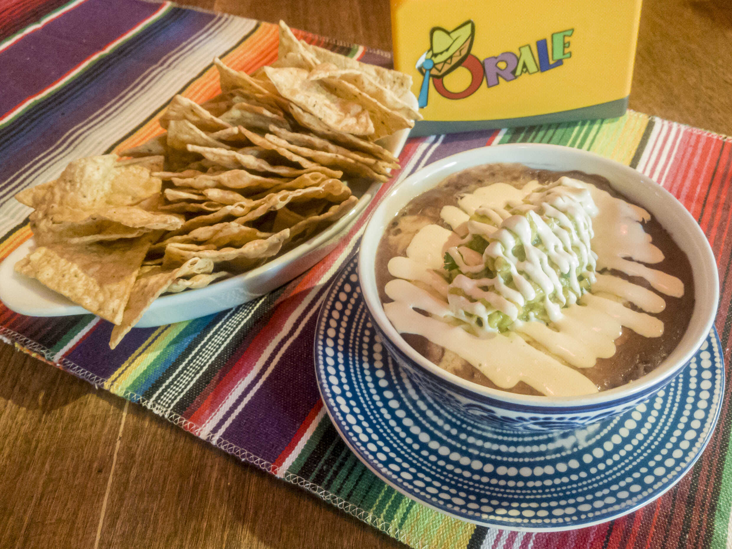 Totopos de maíz, frijol refrito, queso, sour cream, chicharrones y guacamole.