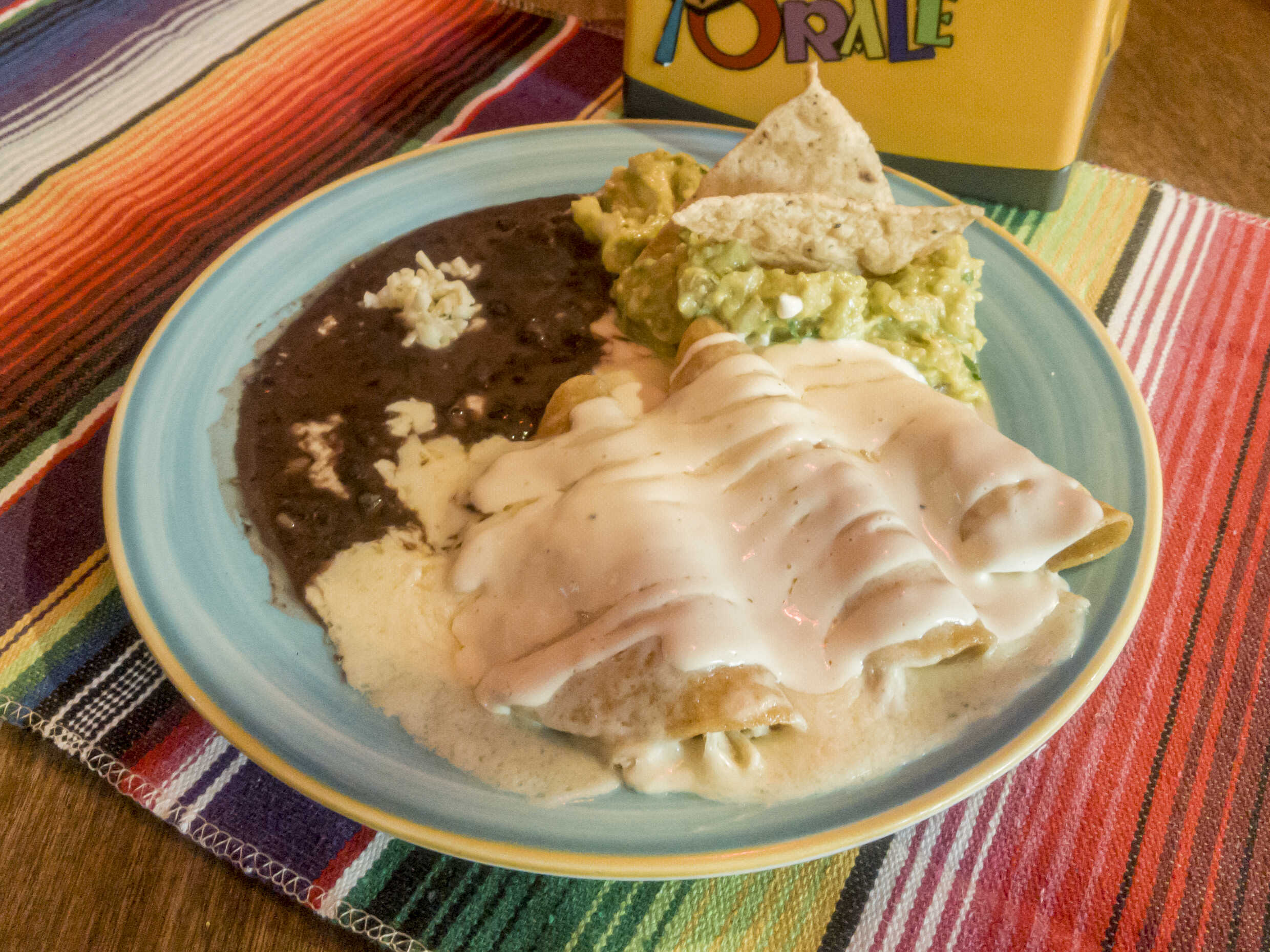Tortilla de harina, rellena de carne de cerdo, pollo, tocineta, queso, guacamole y sour cream.