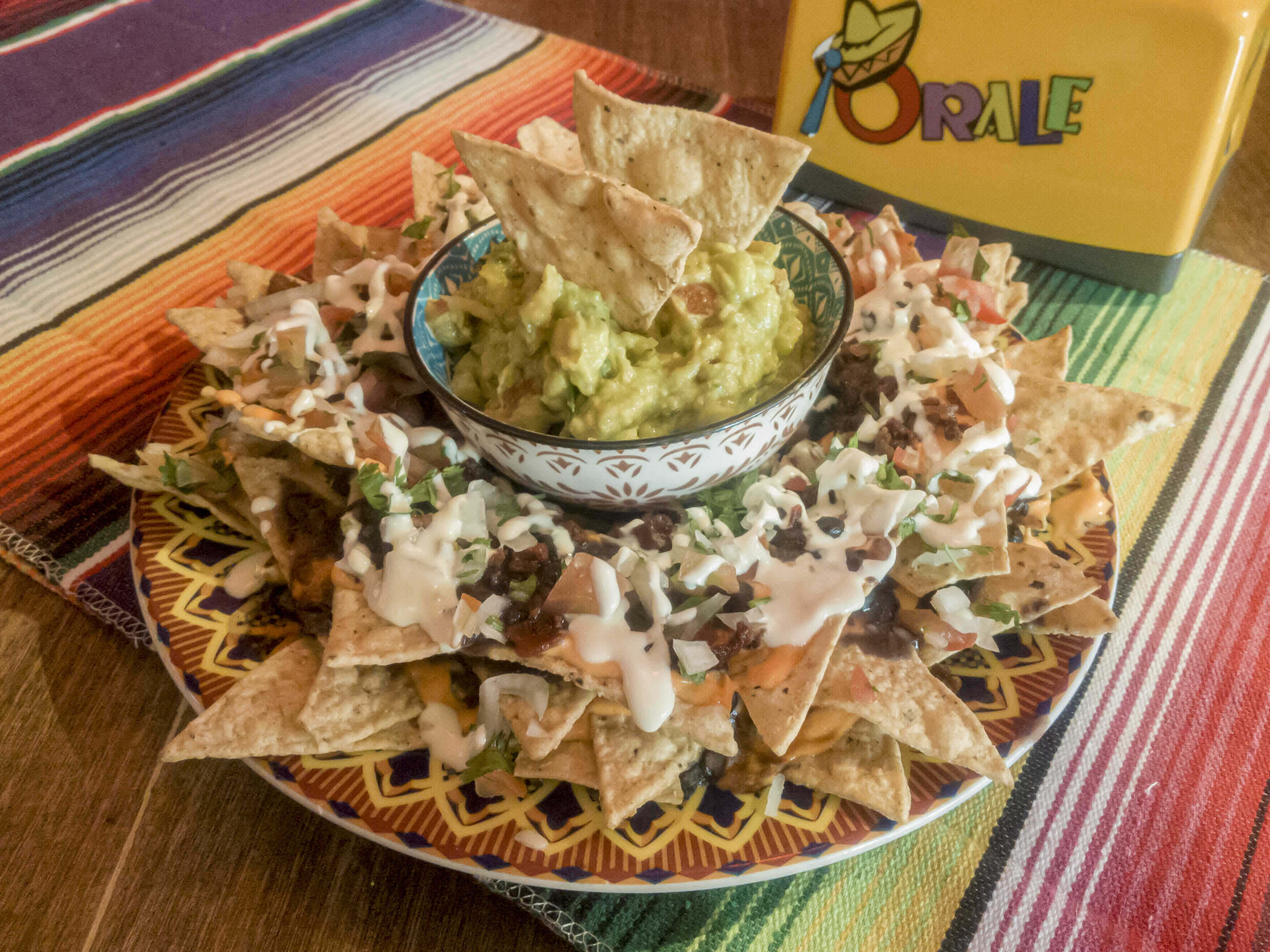 Nachos, queso cheddar, tocineta, frijol refrito, pico de gallo, guacamole, sour cream y jalapeño.