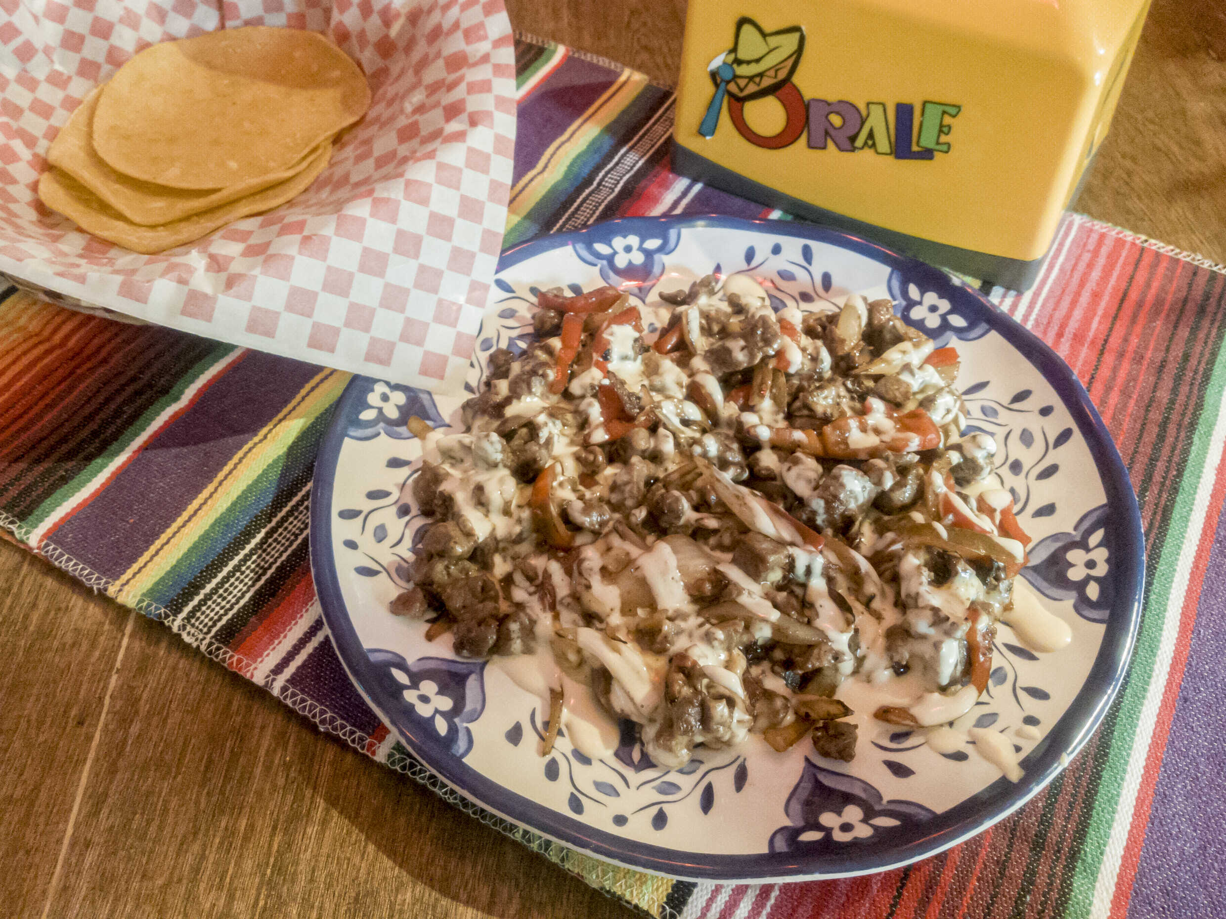 Carne de res, chicharrines, frijol refrito, lechuga, queso, guacamole y crema.