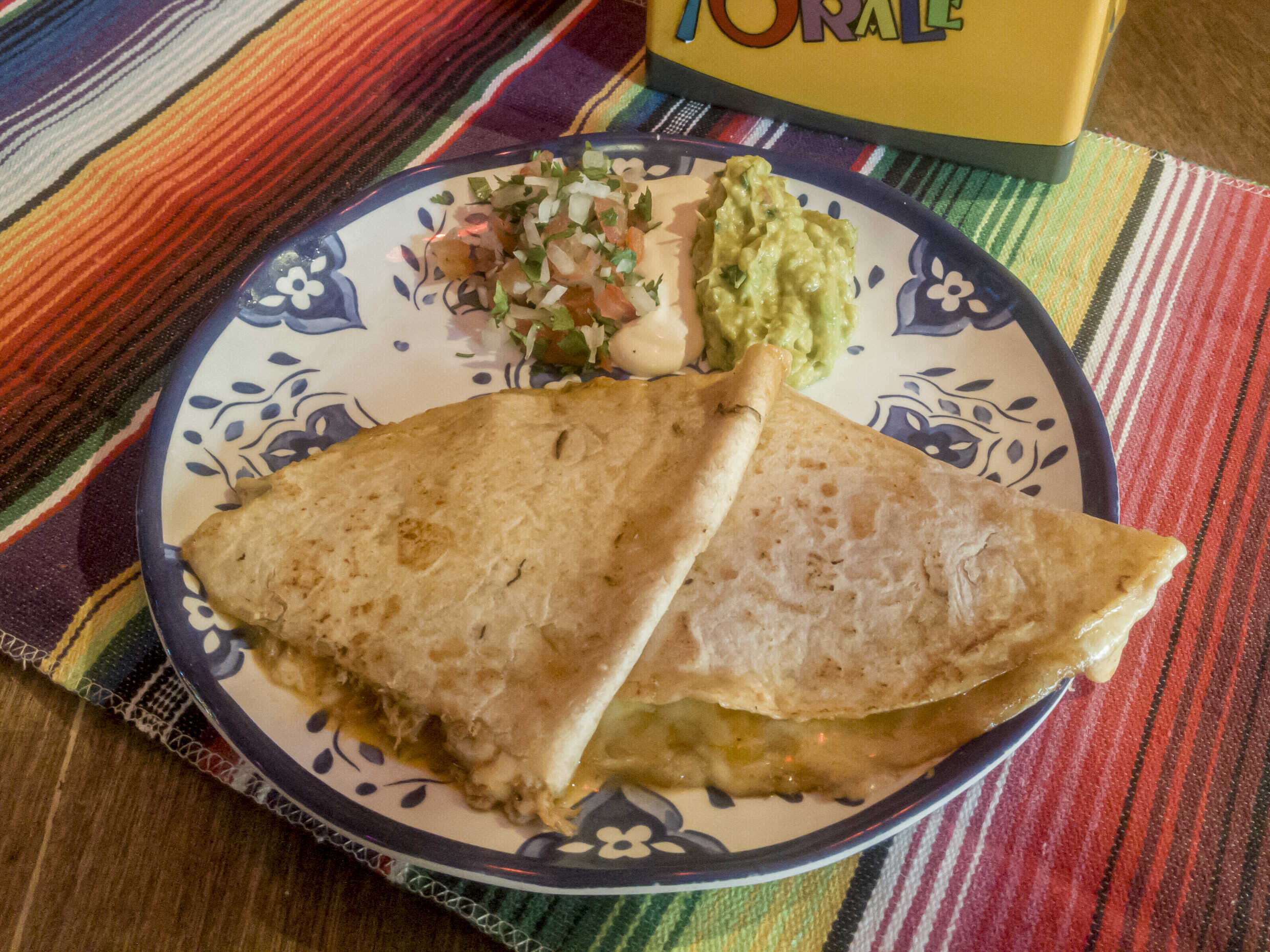Porción de guacamole, porción de nachos, y dos quesadillas de queso.