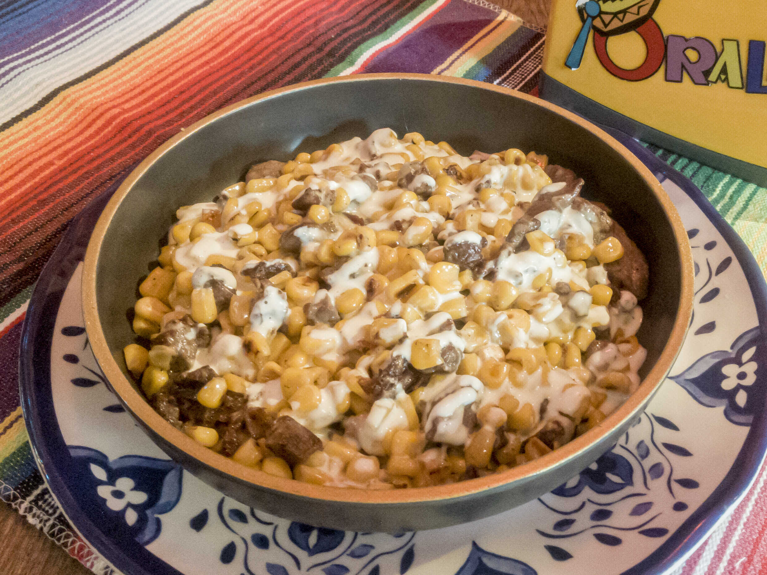 Maicito, queso, carne de cerdo, tocineta y crema.