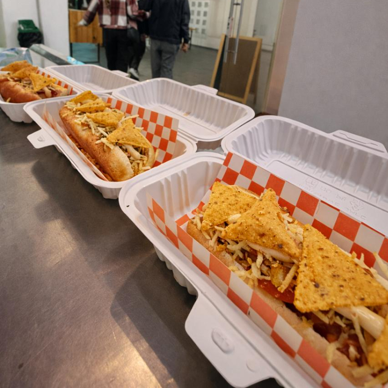 Pan, salchicha, salsa de la casa, guacamole, puerro y tostacos