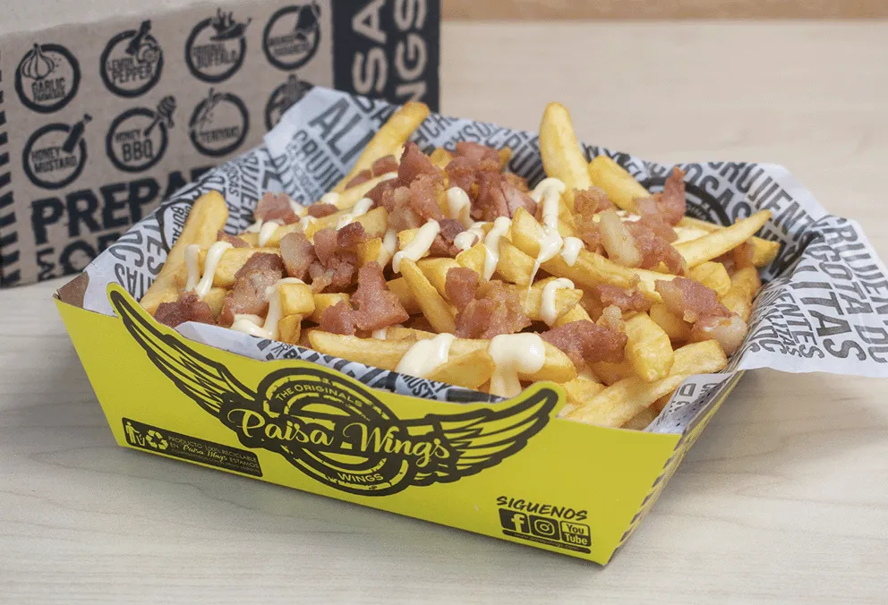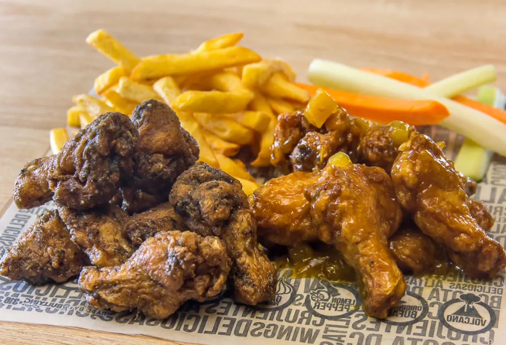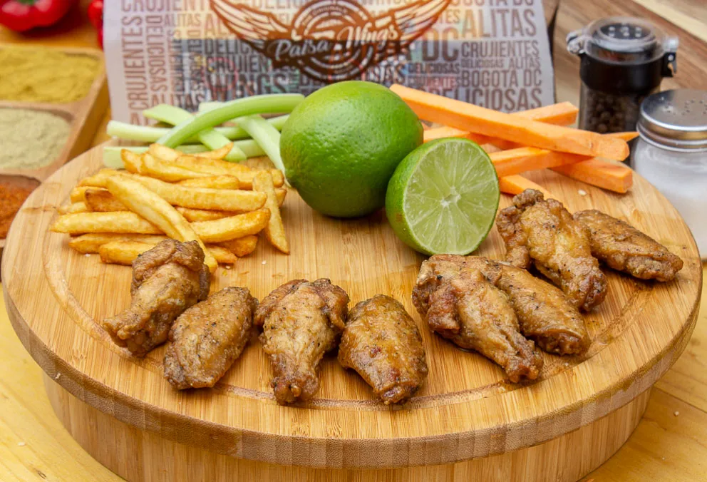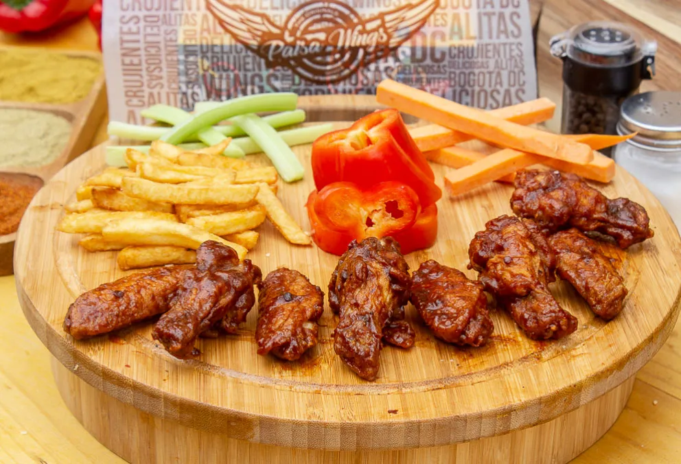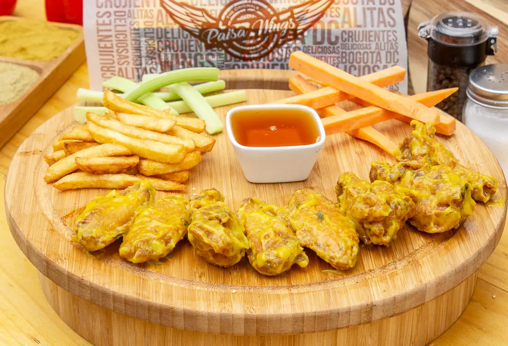 Mix de tenders y alas, acompañadas de apio y zanahoria, con salsas a elección y papas a la francesa.