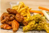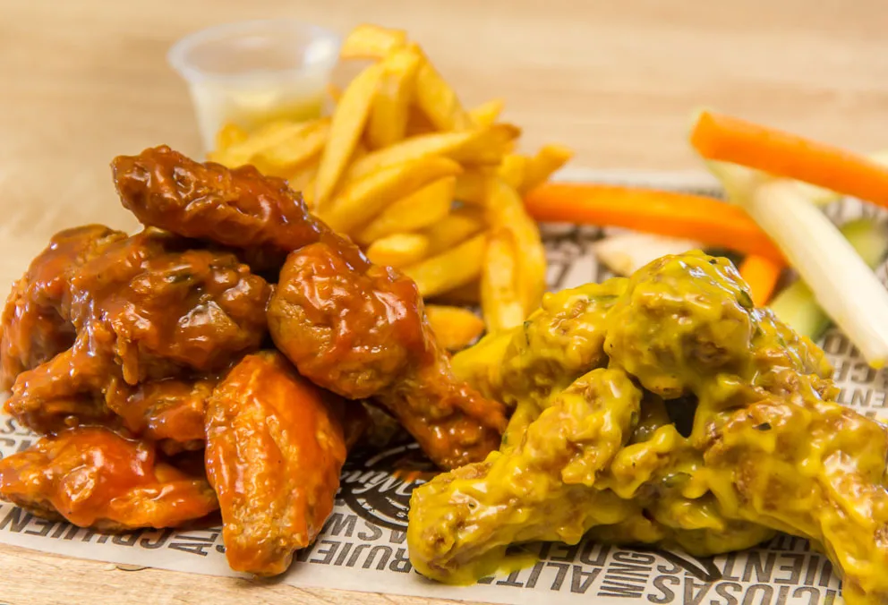 Tenders y alas 34 piezas bañadas con salsa a elección, vegetales y papas a la francesa.