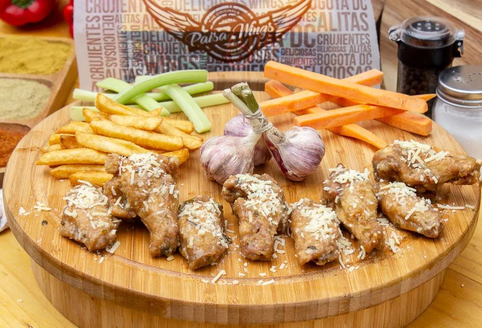 Alas 24 piezas bañadas con salsa a elección, vegetales y papas a la francesa.