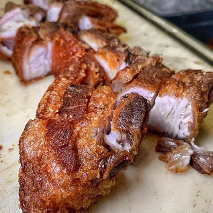 Contiene papa cocina, costilla, chicharrón, carne de cerdo, arepa.