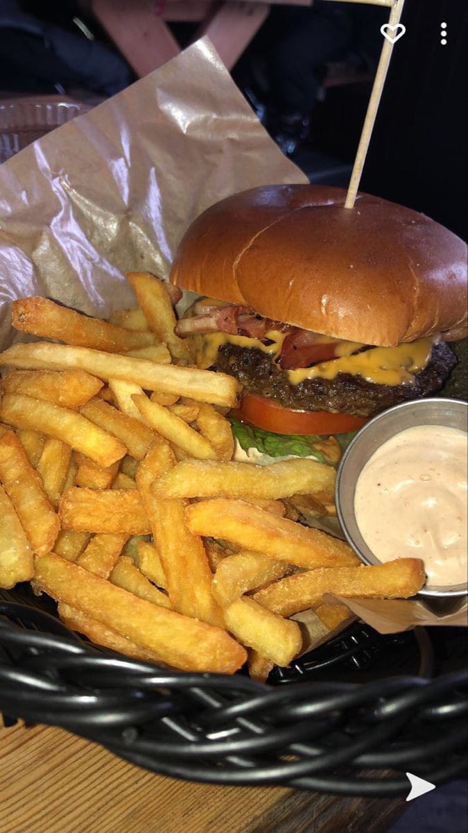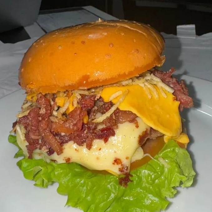 200 g De carne de res ahumada al barril, doble capa de queso fundido, trozos de chicharrón crocante , lechuga fresca con tomate maduro. Acompañada de papas a la francesa crujientes. Incluye gaseosa de 400 ml