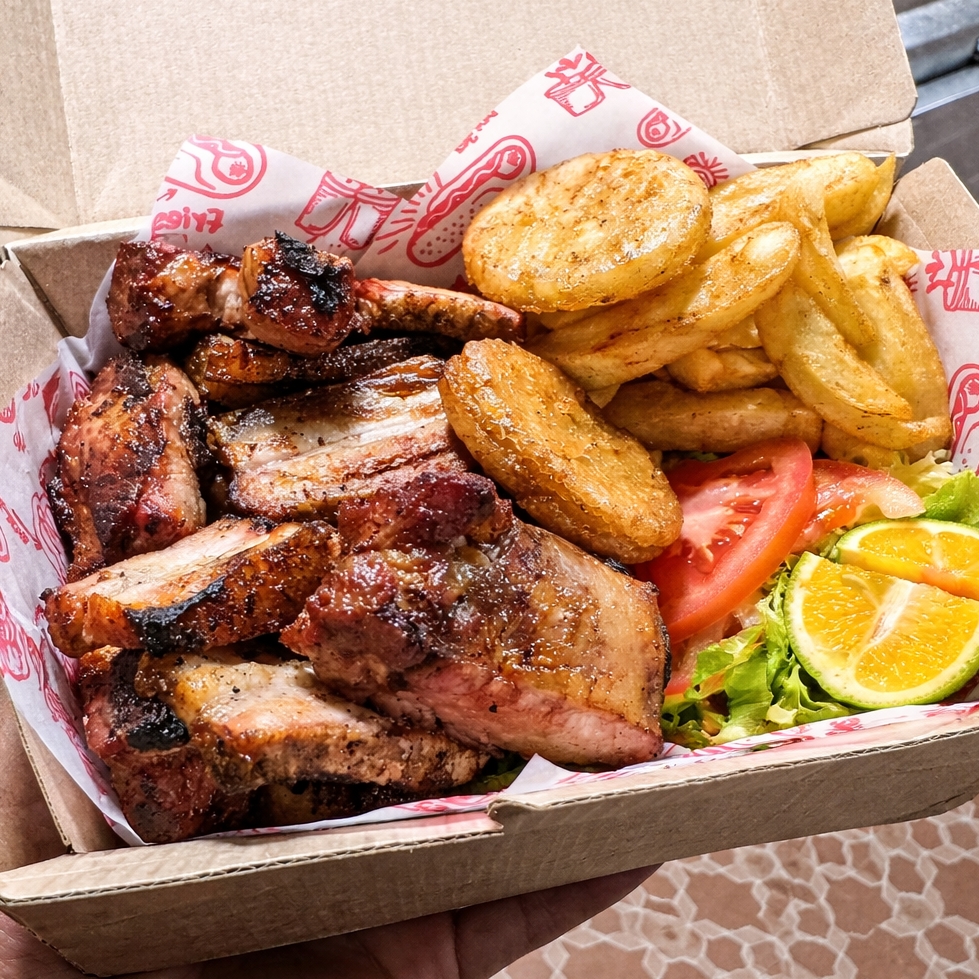 Contiene 300g de costilla de cerdo, papas cocina, ensalada dulce y arepa.