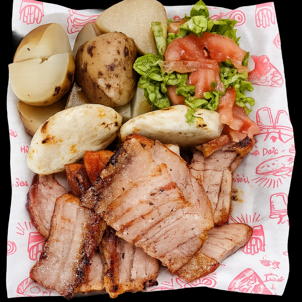 Disfruta de 300 g de bondiola al barril, crujiente por fuera y jugoso por dentro. Acompañado de papa cocinada , una clásica arepa dorada y una fresca ensalada que equilibra cada bocado.