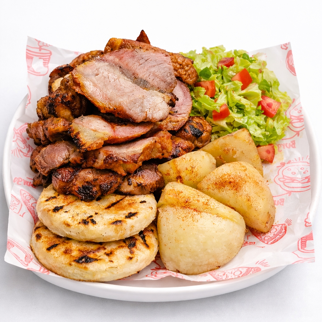 Disfruta de una porción perfecta con 250 g de bondiola tierna, 90 g de chicharrón crocante, 100 g de costilla jugosa, todo con el inconfundible sabor al barril. Acompañado de papas cocinada y dos arepa tradicional.