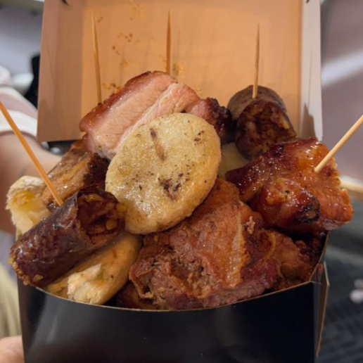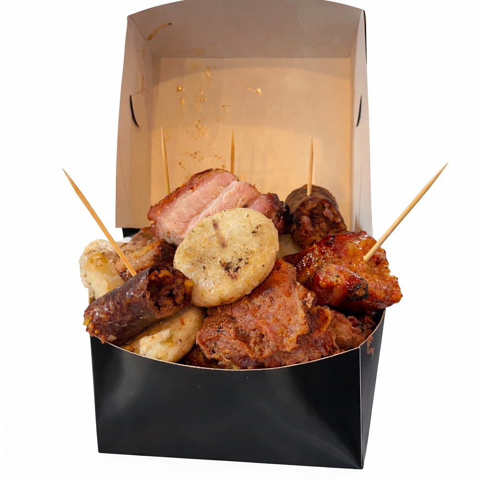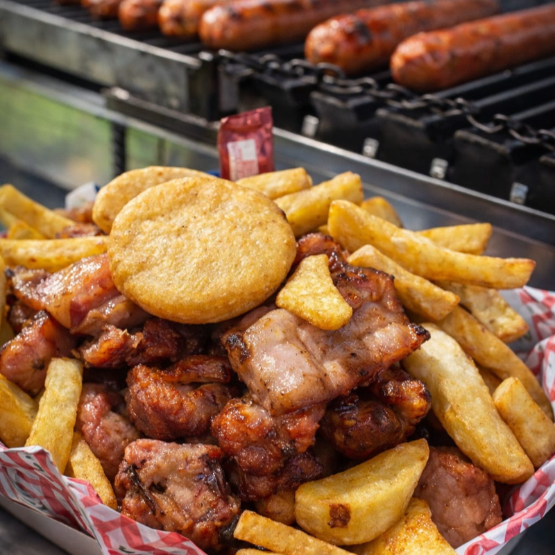 Una combinación irresistible de 250 g de chicharrón crocante y 250 g de costilla ahumada, preparados al barril para lograr el equilibrio perfecto entre jugosidad y textura. Cada bocado es una explosión de sabor, acompañado de arepa dorada y papa cocinada y ensalada .