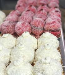 Nuestras peras dulces rellenas de dulce de guayaba o arequipe, adornada con coco rallado.