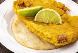 Tradicional torta de pescado frito más arepa de maíz, apenas para desayunar y merendar.