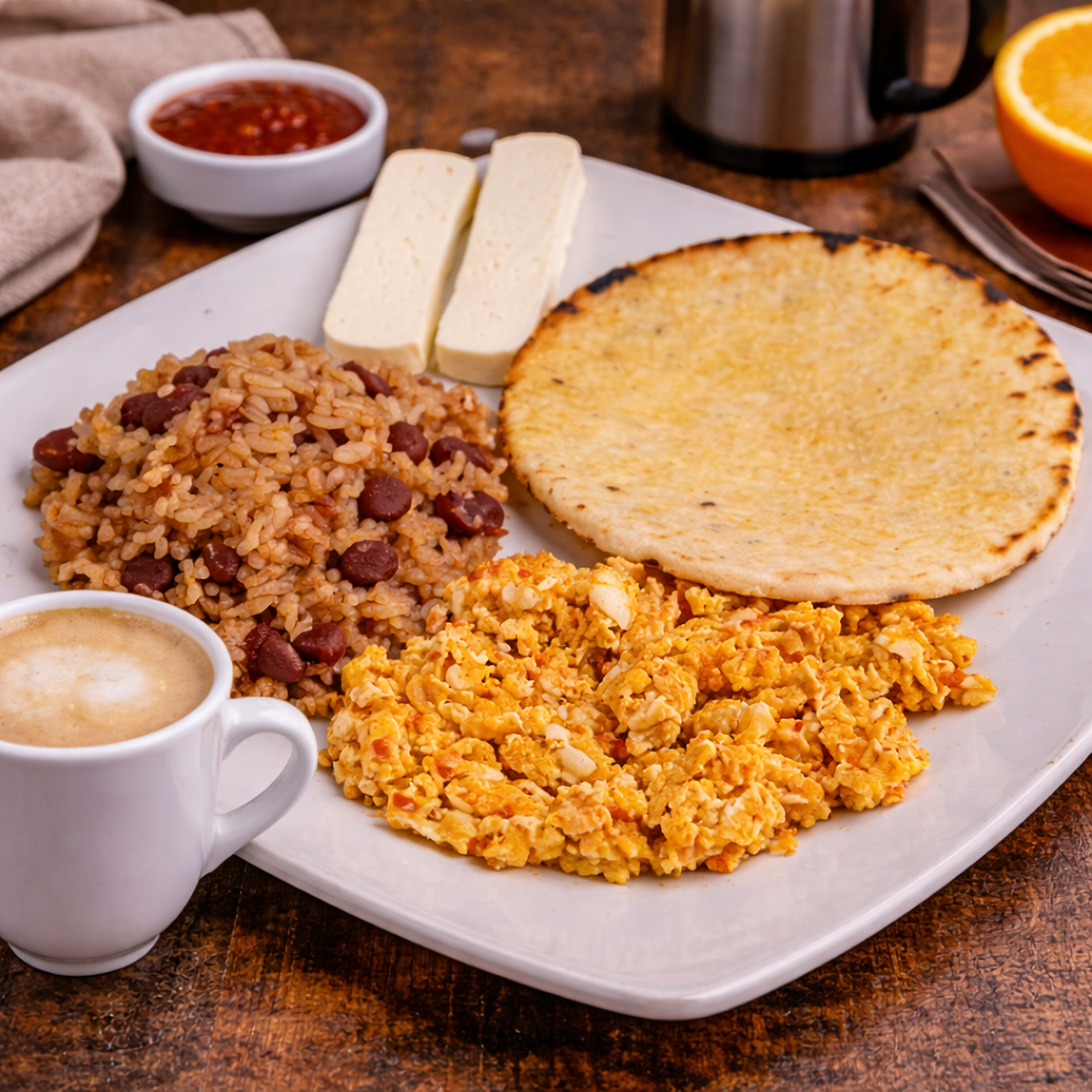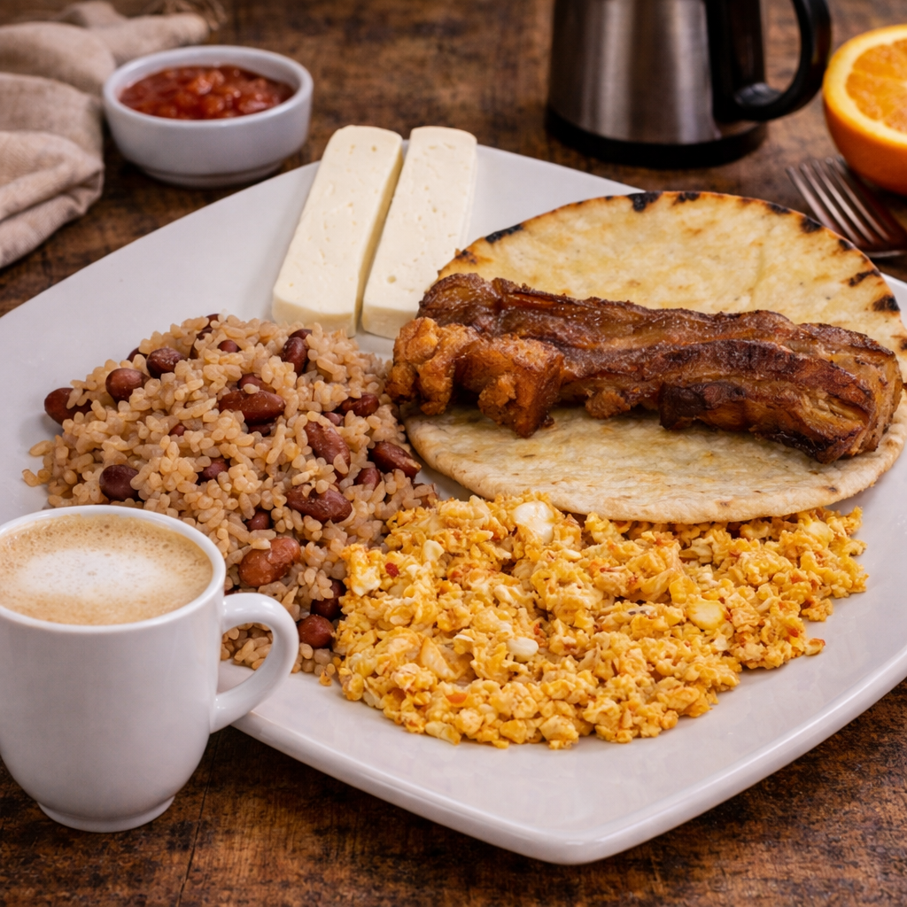 Huevos, calentado paisa, carne a eleccion, arepa con quesito y bebida.