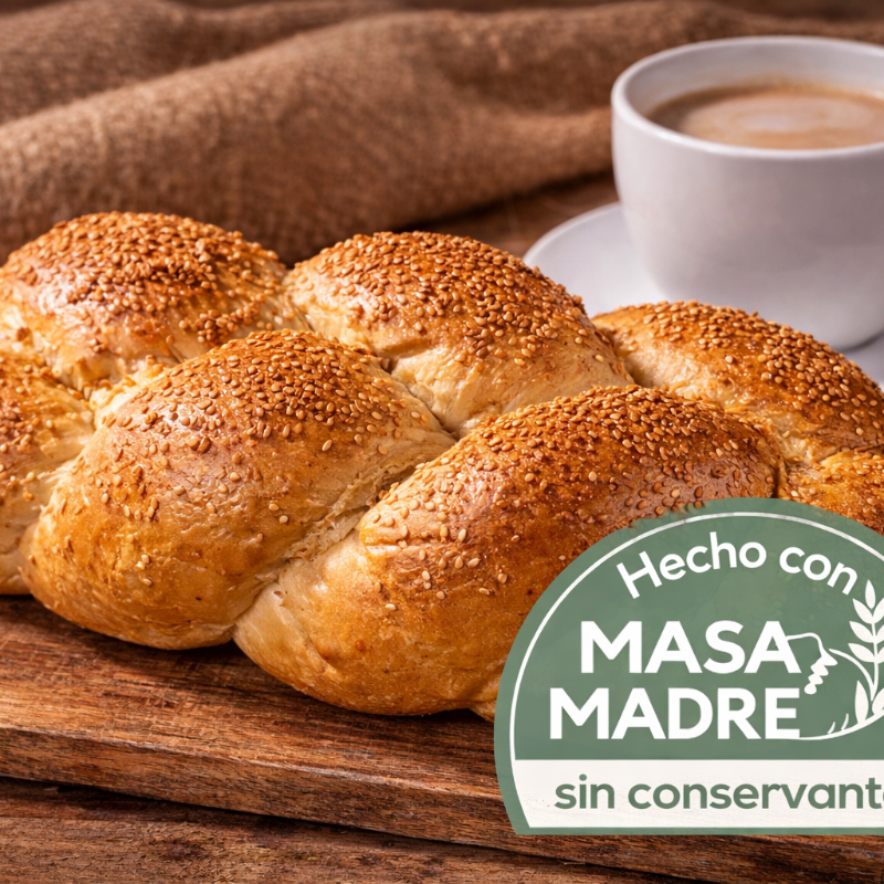 Pan artesanal con masa madre, enriquecido con leche en polvo, huevo, margarina, decorado con crema de queso mozzarella