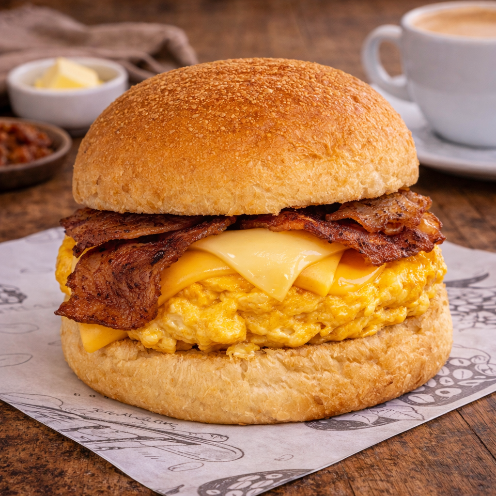Pan artesano de maiz con masa MADRE, tortilla de huevo, queso amaericano, tocineta y salsa de maiz.