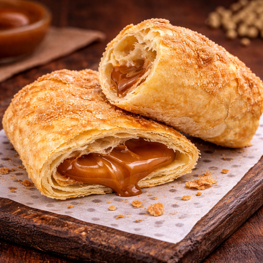 Hojaldrado tradicional (con mantequilla y leche en polvo) relleno con arequipe artesanal.