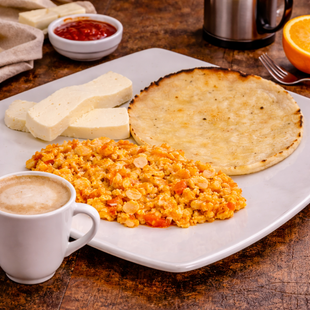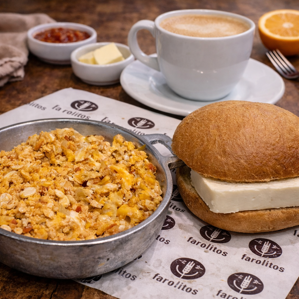 Huevos, pan de maiz, quesito y bebida (FAROLITOS)