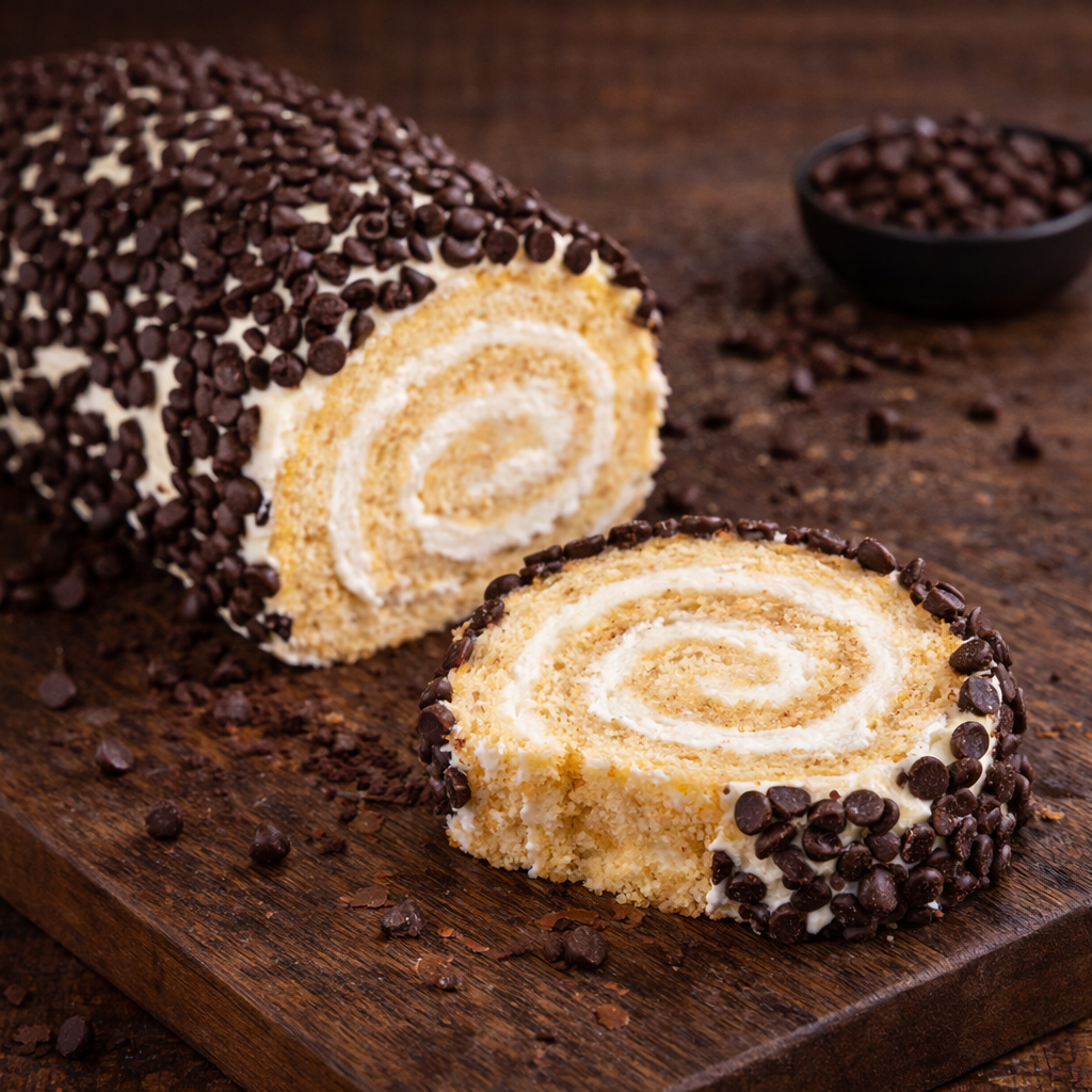 Tradicional rollo relleno de crema de vainilla y chips de chocolate