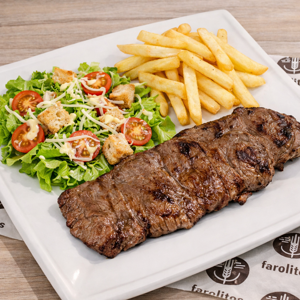 Crema del dia o frijoles, Carne (90g), papitas, arroz, ensalada y bebida
