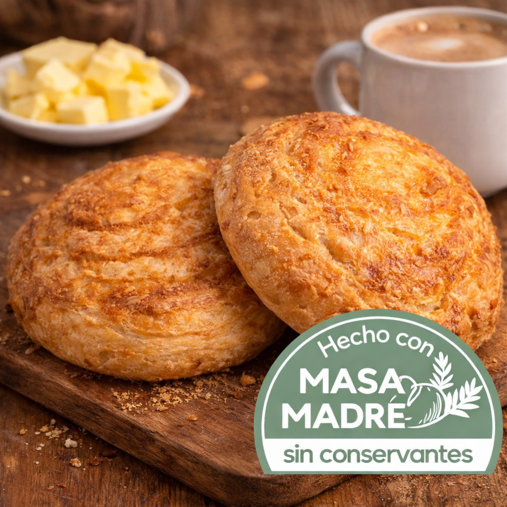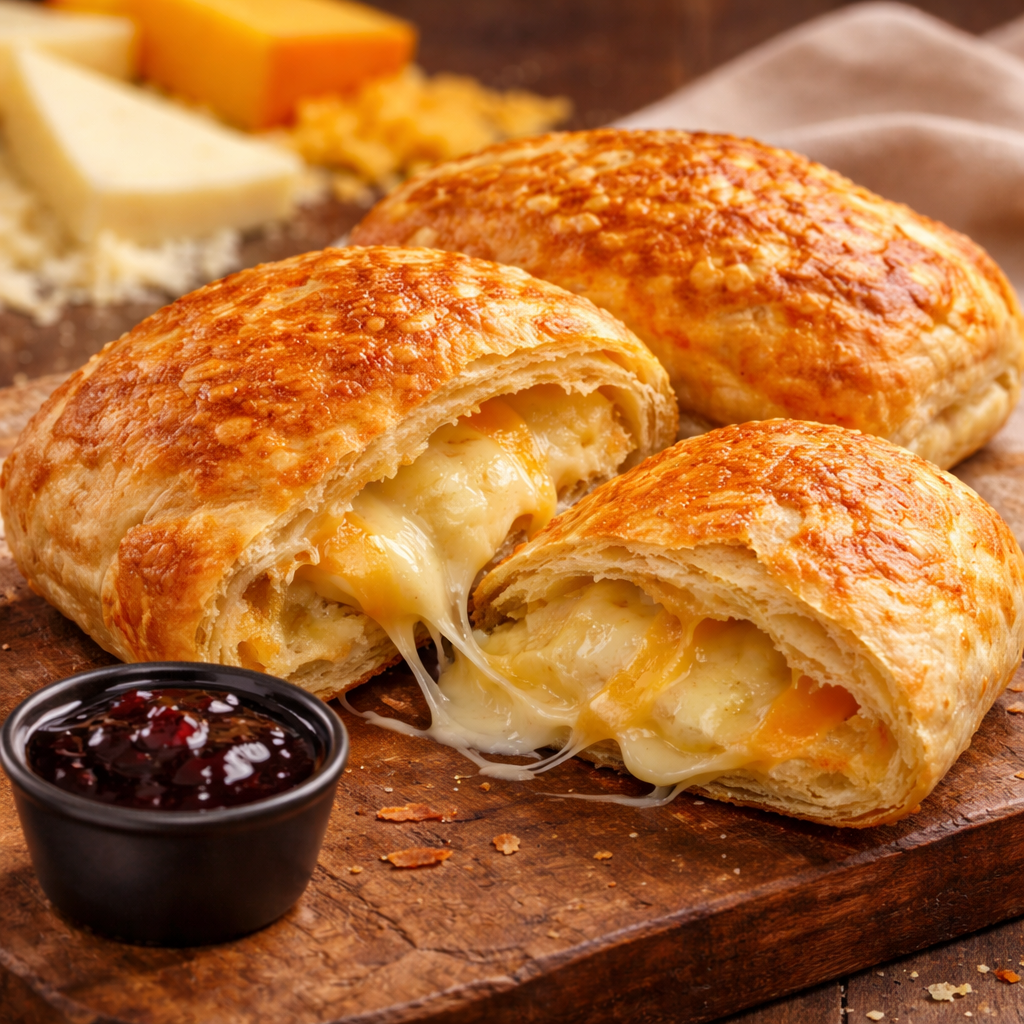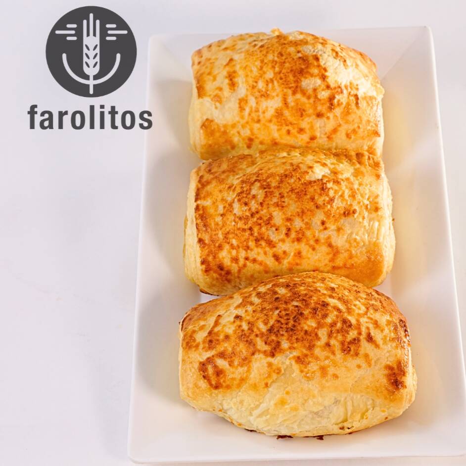 Hojaldrado tradicional (con mantequilla y leche en polvo) relleno de 3 quesos.