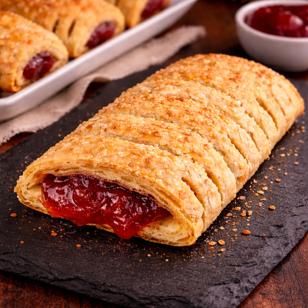 Hojaldrado tradicional (con mantequilla y leche en polvo) relleno con bocadillo artesanal.