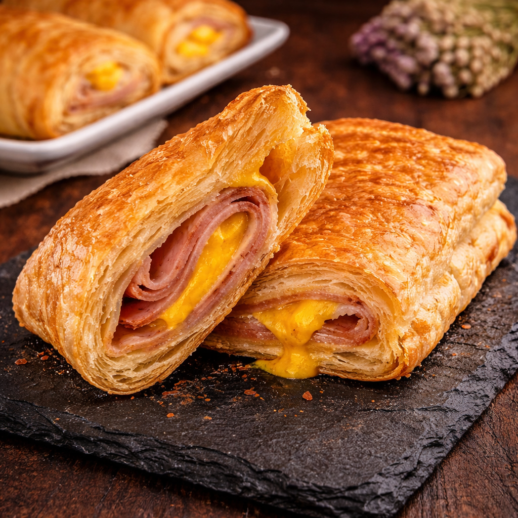 Hojaldrado tradicional (con mantequilla y leche en polvo) relleno con jamon y queso americano.