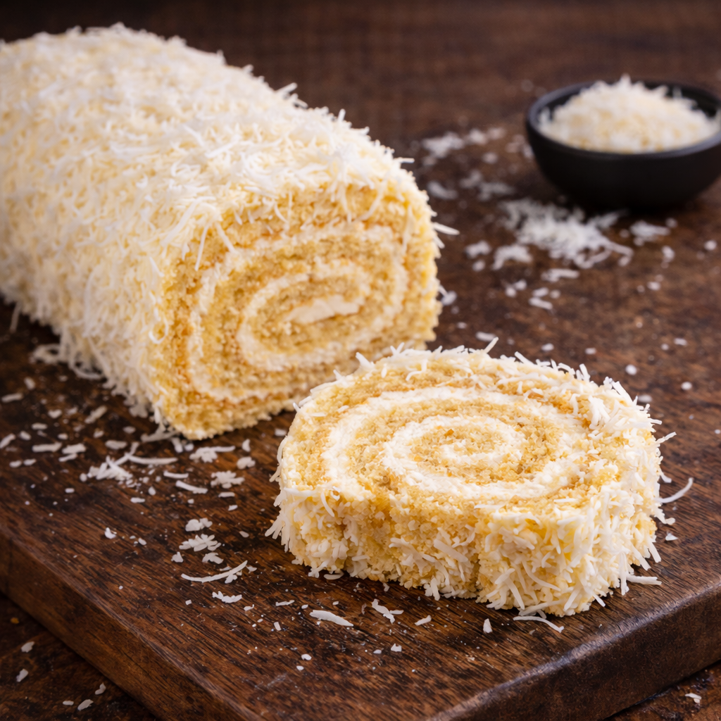Tradicional rollo relleno con crema de vainilla y cubierto de coco