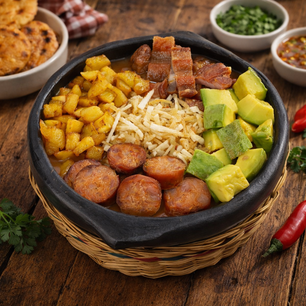 Frijoles antioqueños, chorizo, chicharron, aguacate, ripio de papa, madurito y bebida.