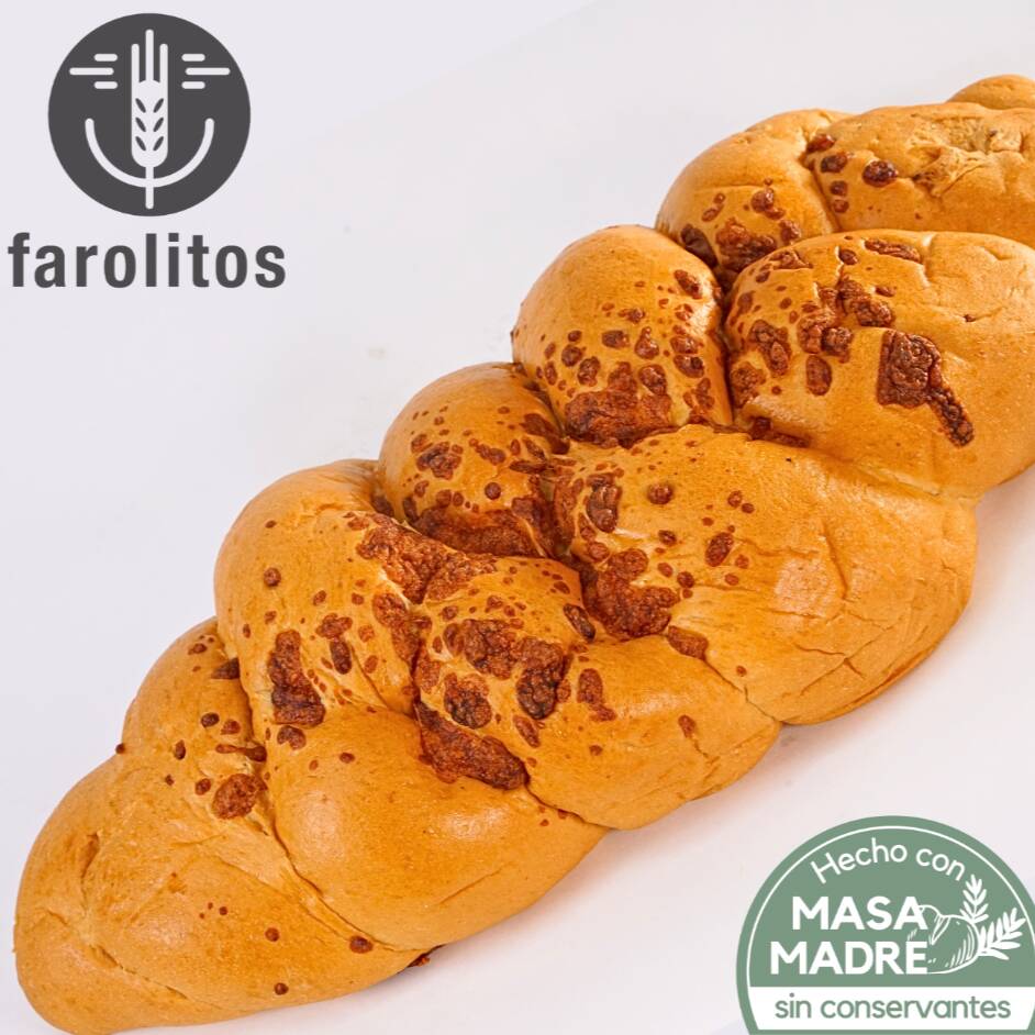 Pan artesanal con masa madre, enriquecido con leche en polvo, huevo, margarina, decorado con crema de queso mozzarella