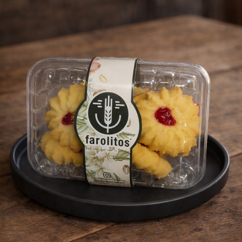 Hojaldrado tradicional (con mantequilla y leche en polvo) relleno con queso campesino acompañado de mermelada de mora.
