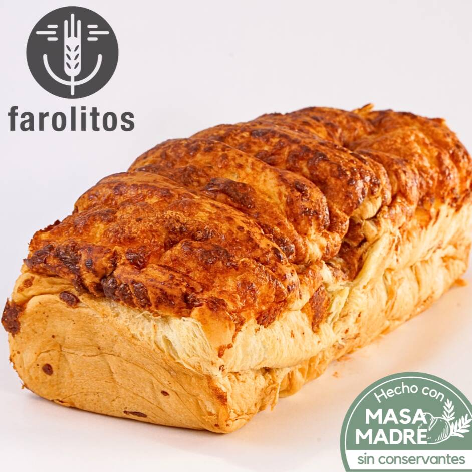 Pan artesanal con masa madre, enriquecido con leche en polvo, huevo, margarina y decorado con crema de queso mozarella.