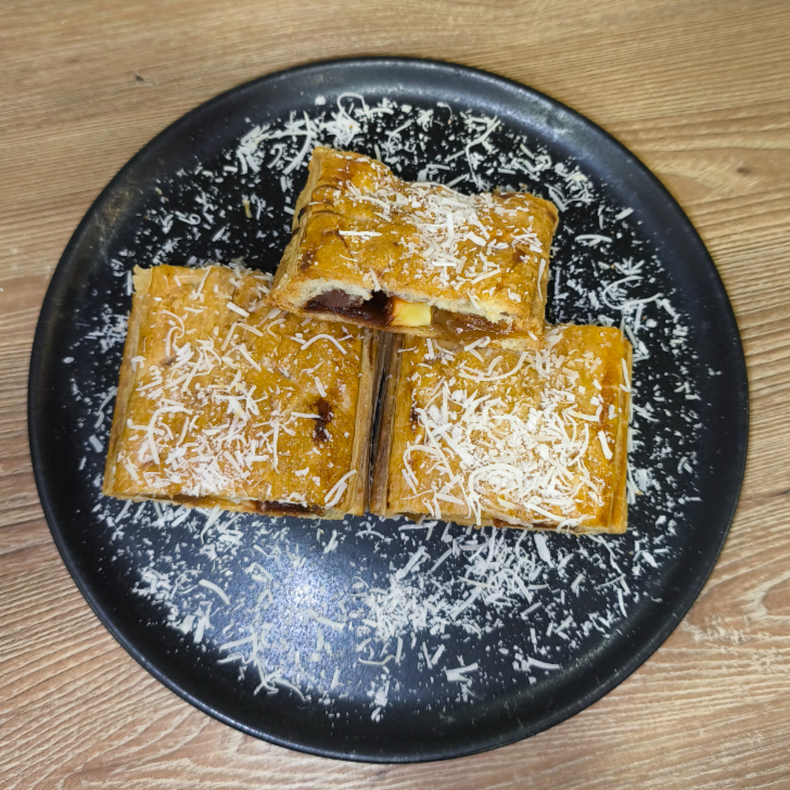 Pastel hojaldrado relleno con queso cuajada, costeño y mozarella