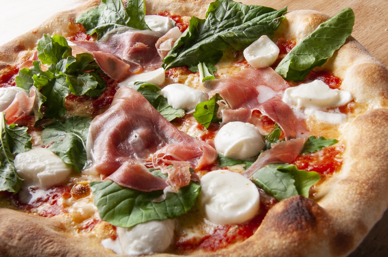 Pizza bufalina mediana, tomate en salsa, mozzarella, rucula, jamón serrano y mozzarella de búfala.
